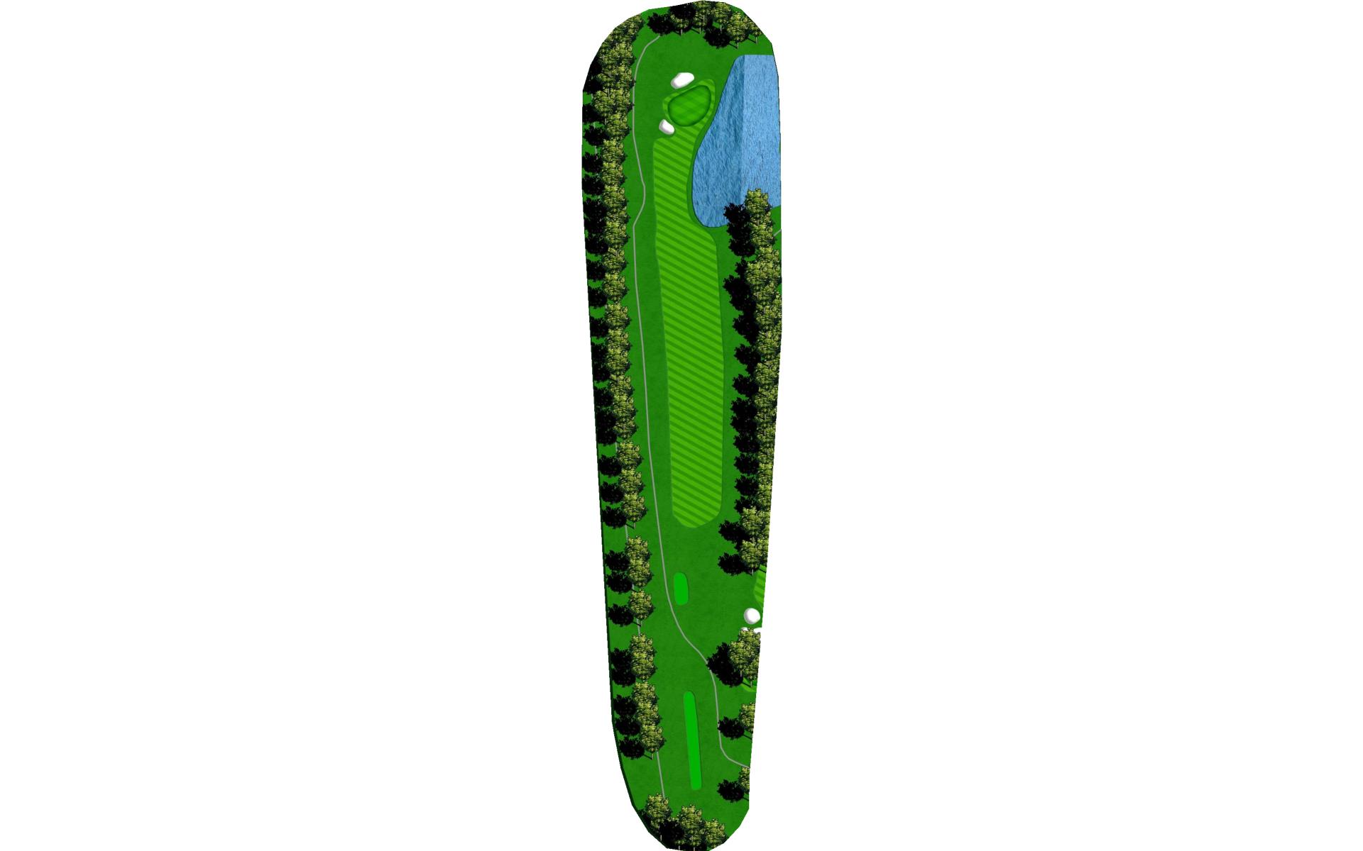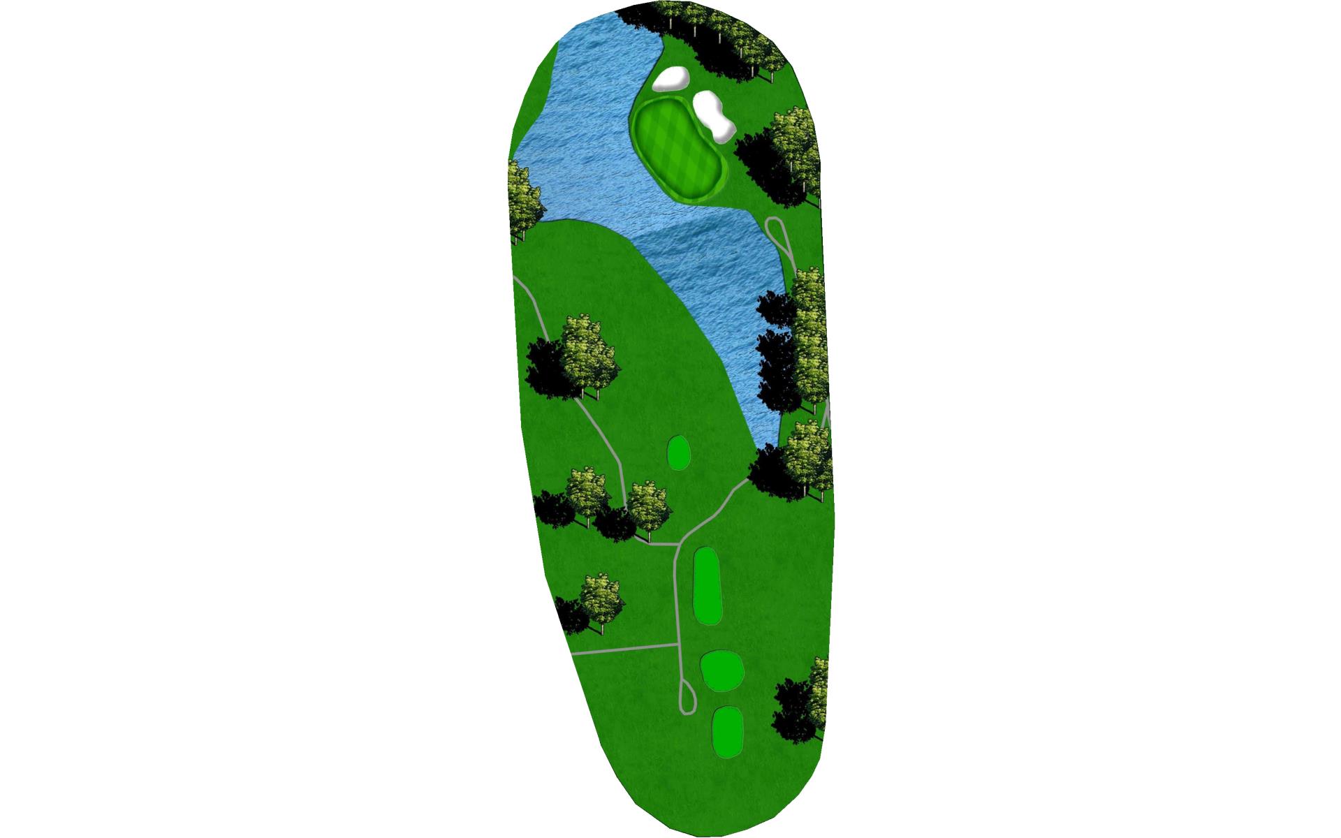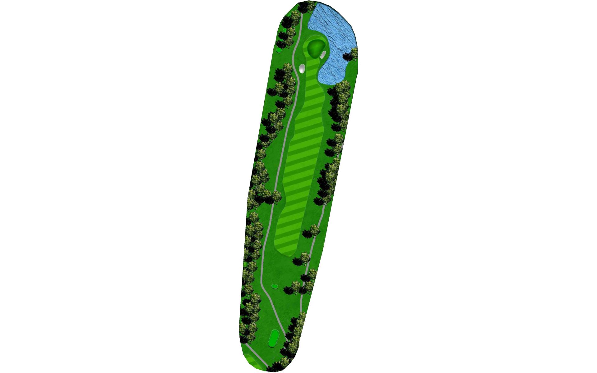 It's a big green, but protected by OB and water. Just aim at the middle of the green and two put for par and you will gain on the field.