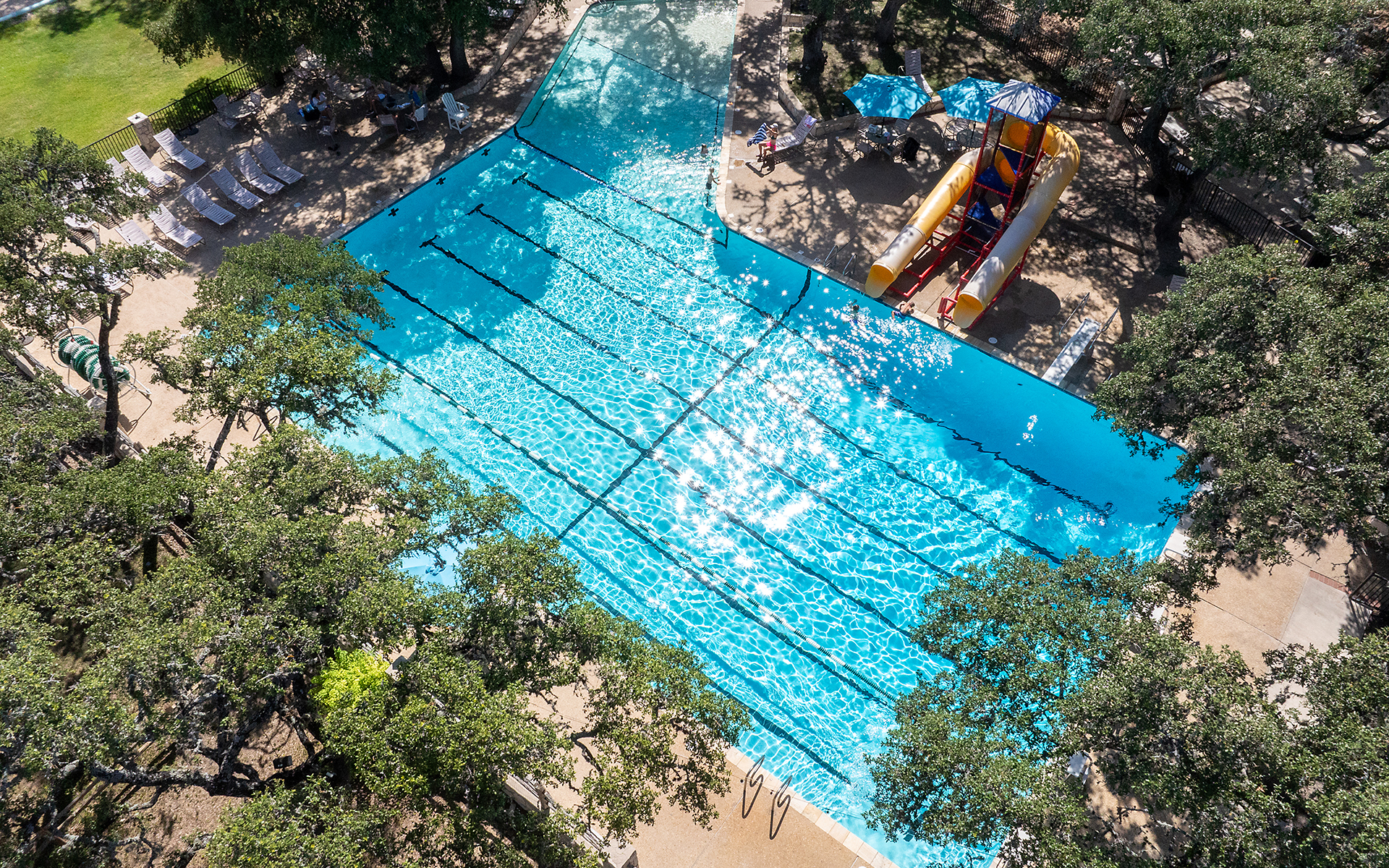 Our beautifully landscaped pool area features everything you need to enjoy a day in the water. Lounge with a chilled beverage or take a leisurely swim in one of our two family pools. Walk in along the beach-style entry, speed down the waterslide, or swim laps to stay fit. Our pool amenities are designed to cater to all ages and interests, including swim lessons, water aerobics, and planned events for both kids and adults. Certified lifeguards and friendly staff are always on hand to ensure a safe and enjoyable experience.